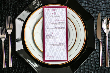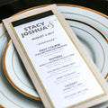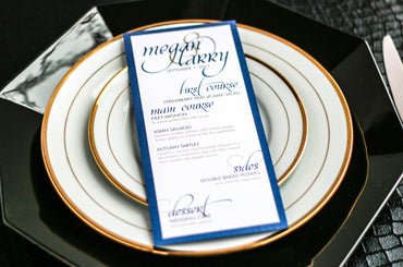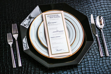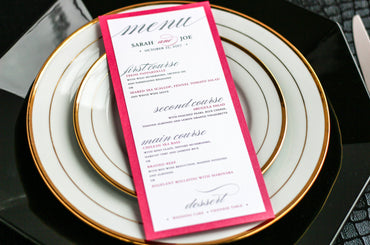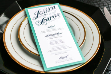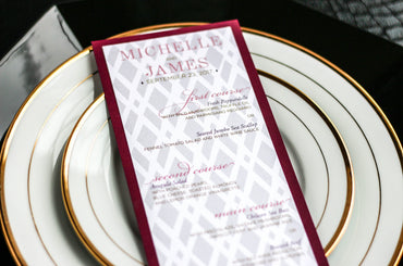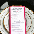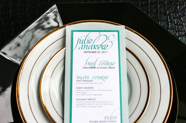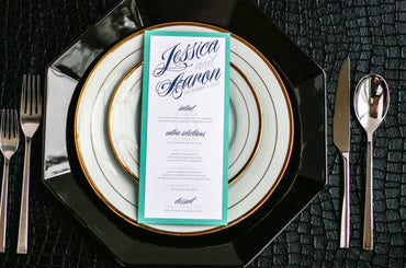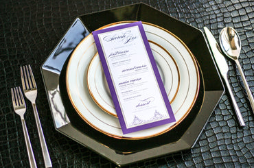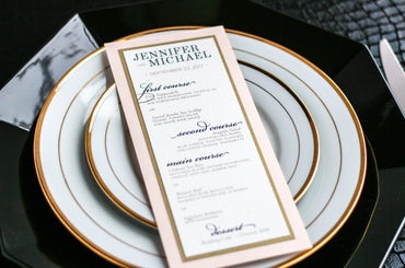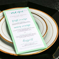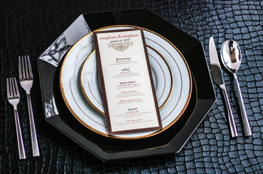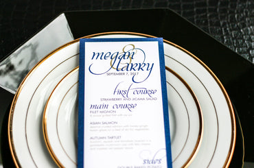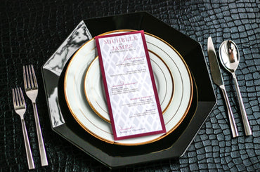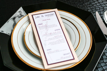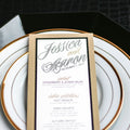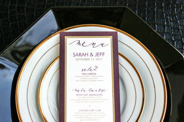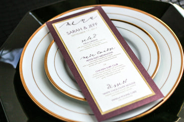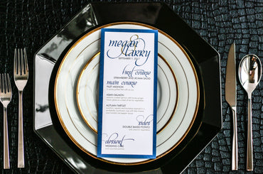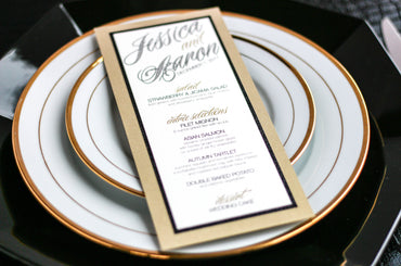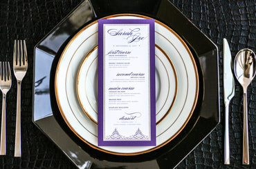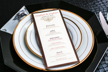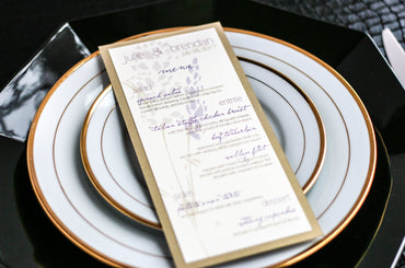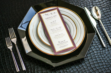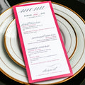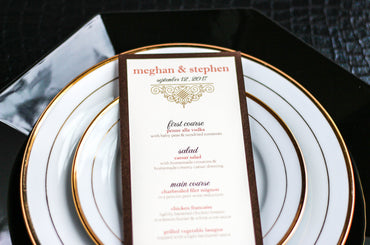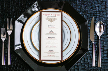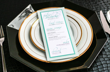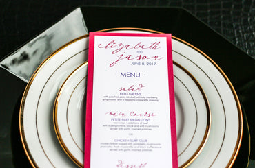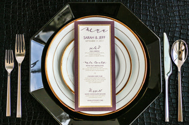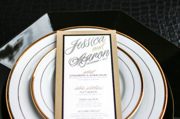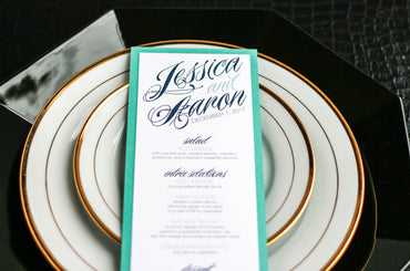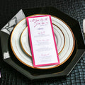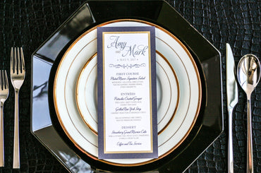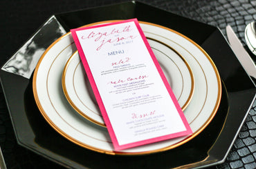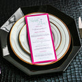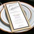 Give your table settings the perfect accessory! Our menus provide your guests with a listing of the delectable dishes on your special day while adding a dash of elegance to your table decor!CALLIGRAPHY CHIC -