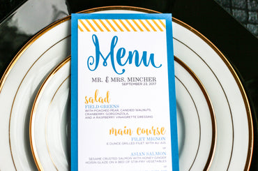 Give your table settings the perfect accessory with a Dinner Menu! Our menus provide your guests with a listing of the delectable dishes on your special day while adding a dash of elegance to your table decor! Check out the other menu styles in our shop for more inspiration and examples!SWEEPING SCRIPT -