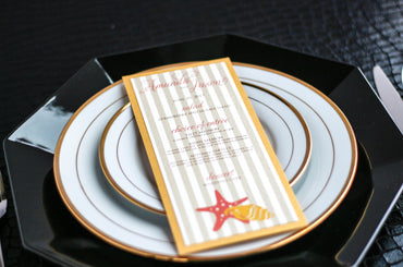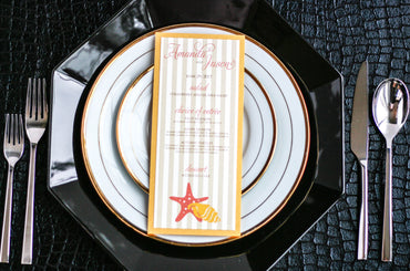 Give your table settings the perfect accessory with a Dinner Menu! Our menus provide your guests with a listing of the delectable dishes on your special day while adding a dash of elegance to your table decor! Check out the other menu styles in our shop for more inspiration and examples!STARFISH AND SHELL -