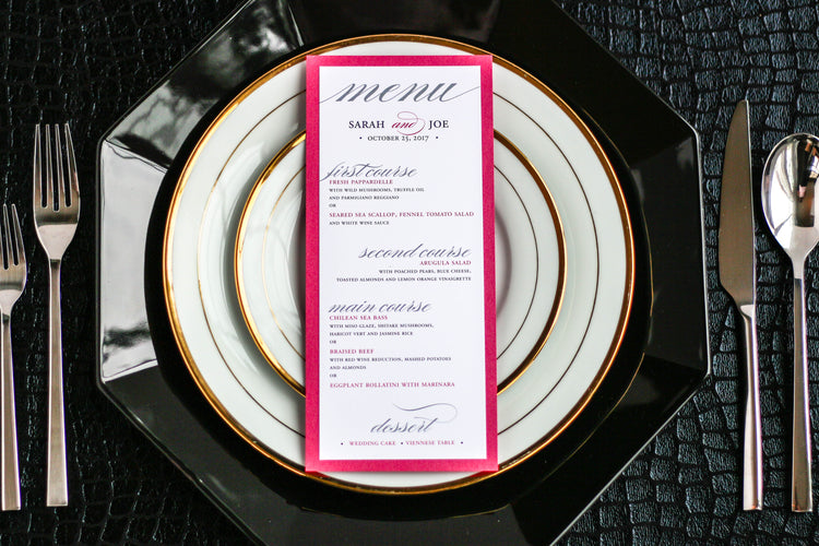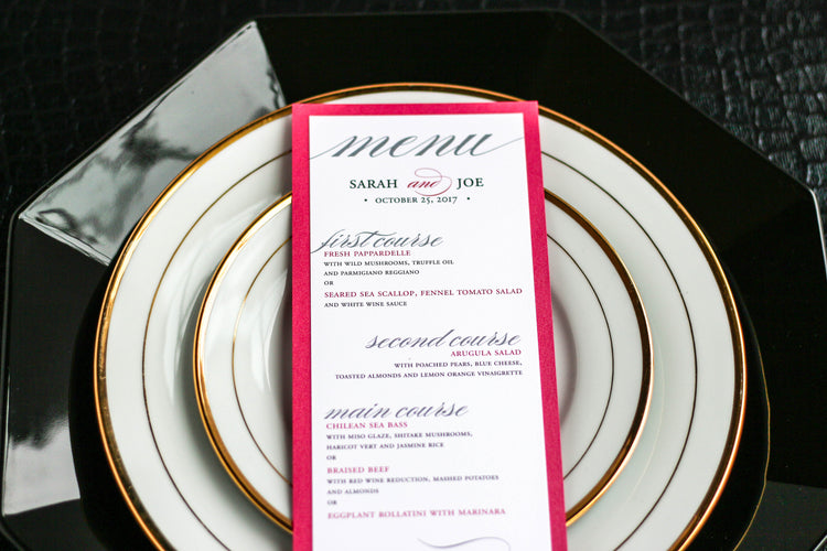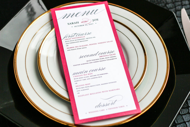 Give your table settings the perfect accessory with a Dinner Menu! Our menus provide your guests with a listing of the delectable dishes on your special day while adding a dash of elegance to your table decor! Check out the other menu styles in our shop for more inspiration and examples!