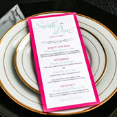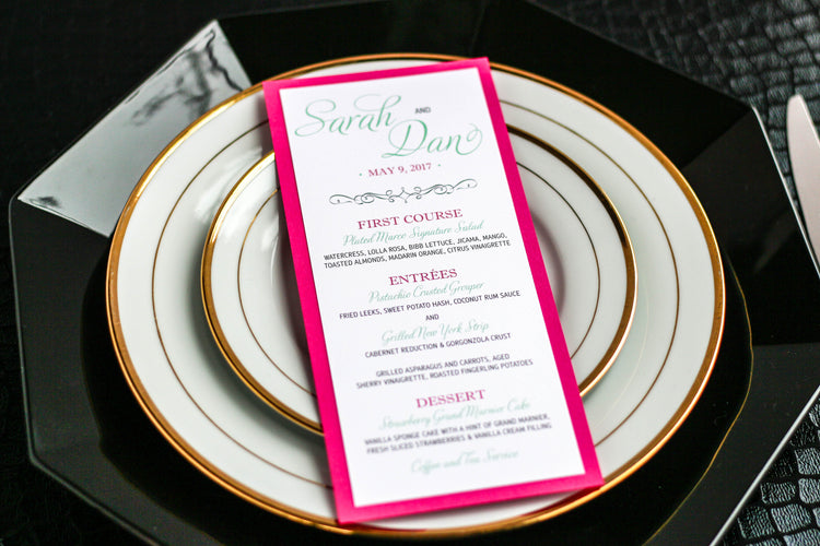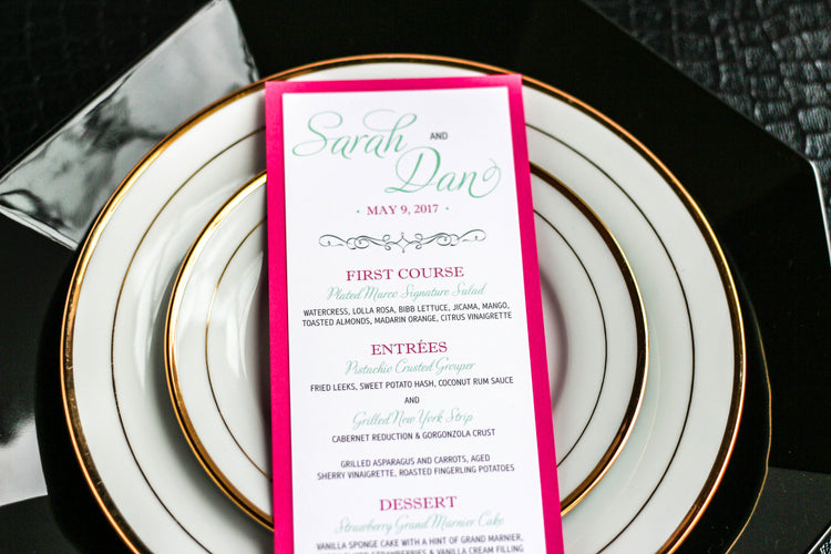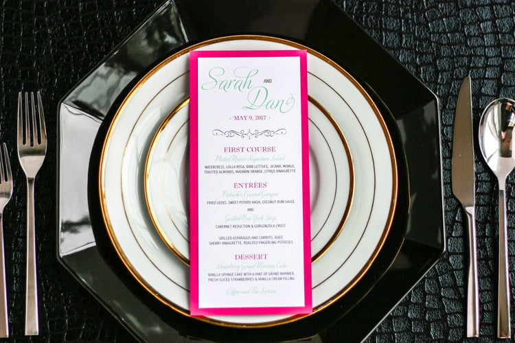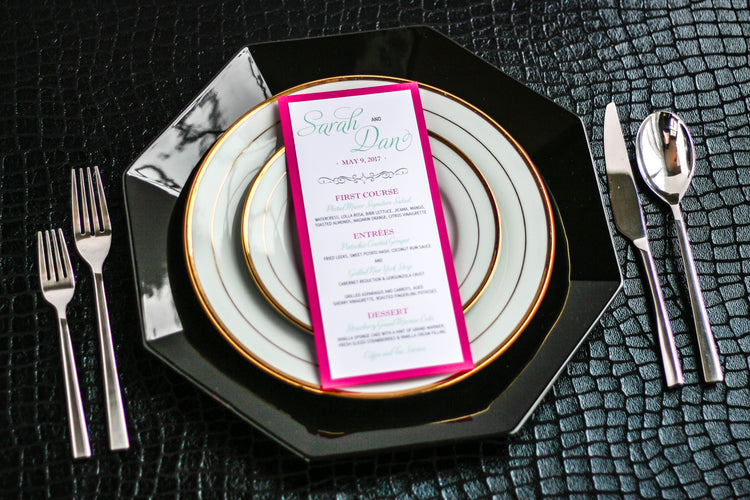 Give your table settings the perfect accessory with a Dinner Menu! Our menus provide your guests with a listing of the delectable dishes on your special day while adding a dash of elegance to your table decor! Check out the other menu styles in our shop for more inspiration and examples!
