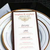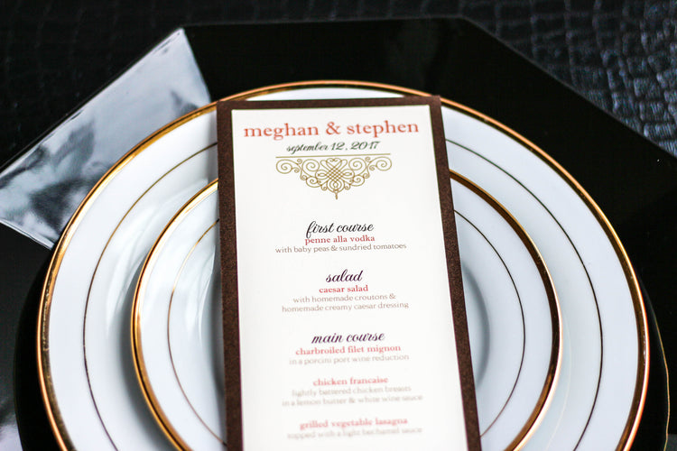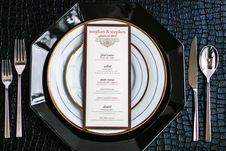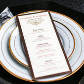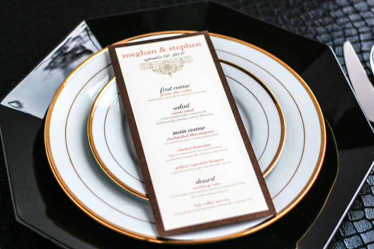 Give your table settings the perfect accessory with a Dinner Menu! Our menus provide your guests with a listing of the delectable dishes on your special day while adding a dash of elegance to your table decor! Check out the other menu styles in our shop for more inspiration and examples!