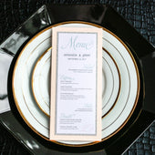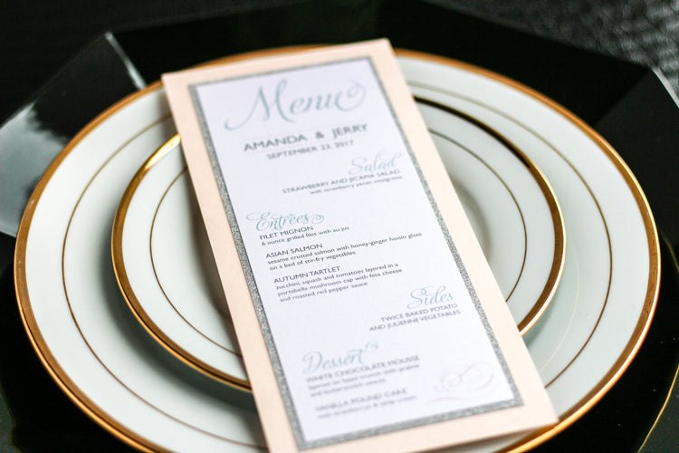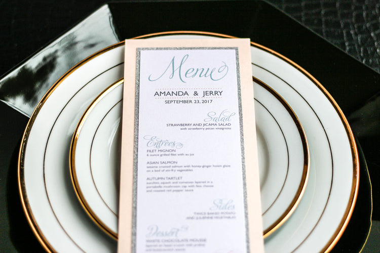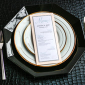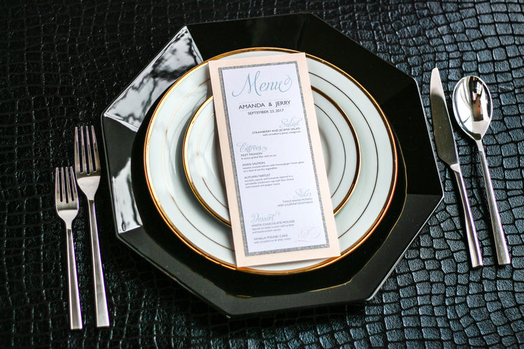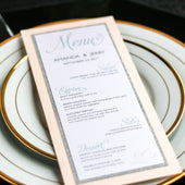 Give your table settings the perfect accessory! Our menus provide your guests with a listing of the delectable dishes on your special day while adding a dash of elegance to your table decor!