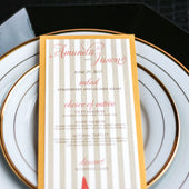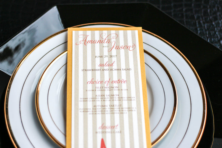 Give your table settings the perfect accessory with a Dinner Menu! Our menus provide your guests with a listing of the delectable dishes on your special day while adding a dash of elegance to your table decor! Check out the other menu styles in our shop for more inspiration and examples!